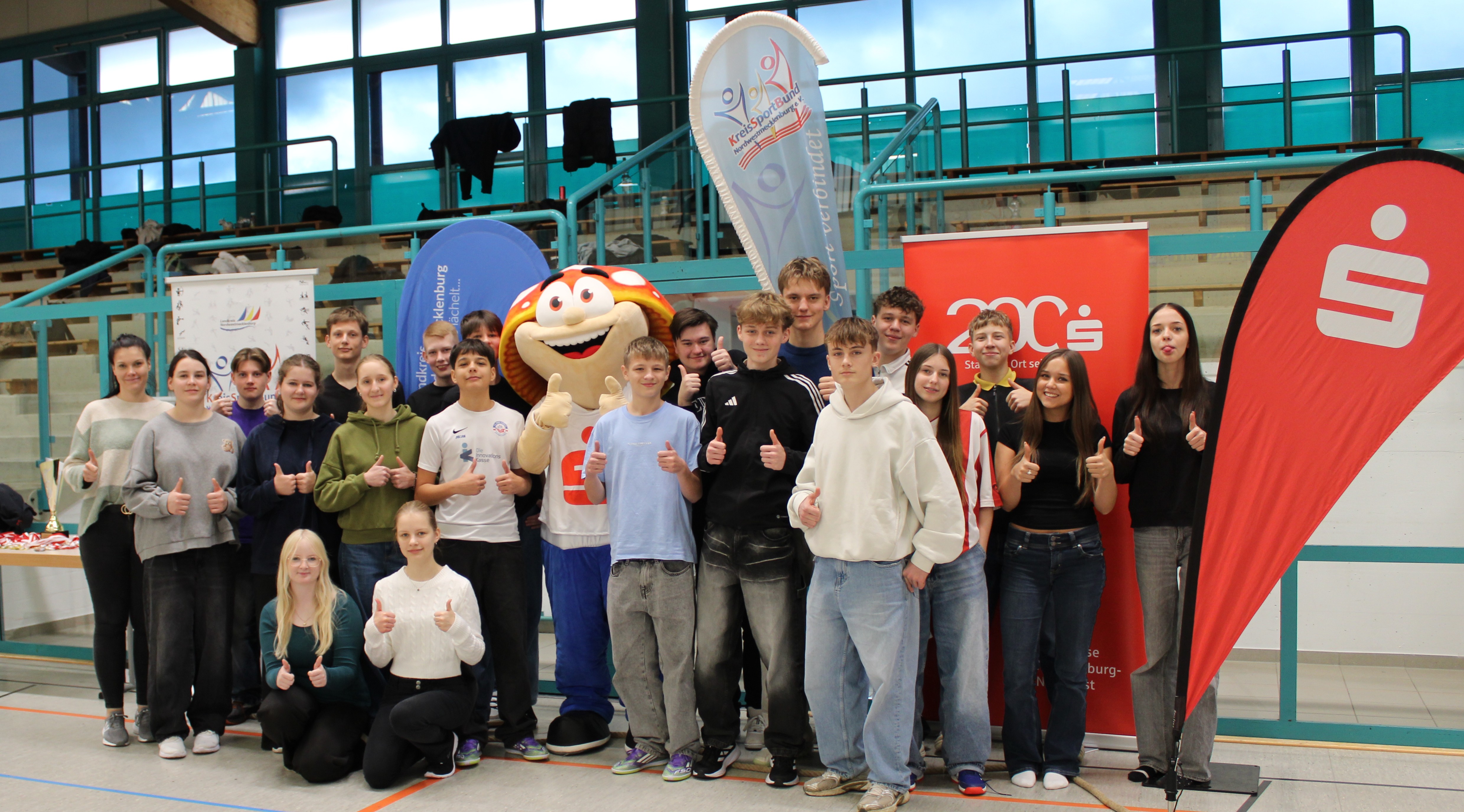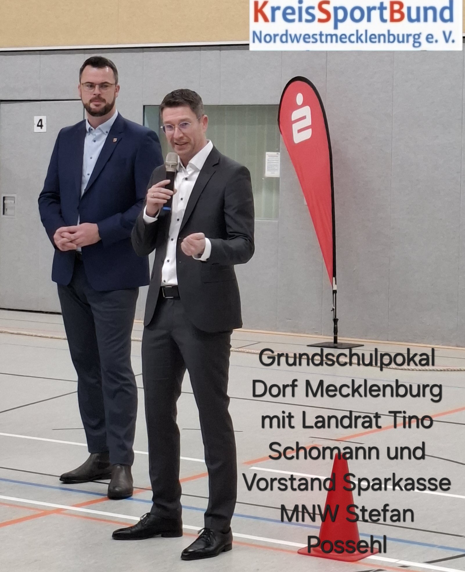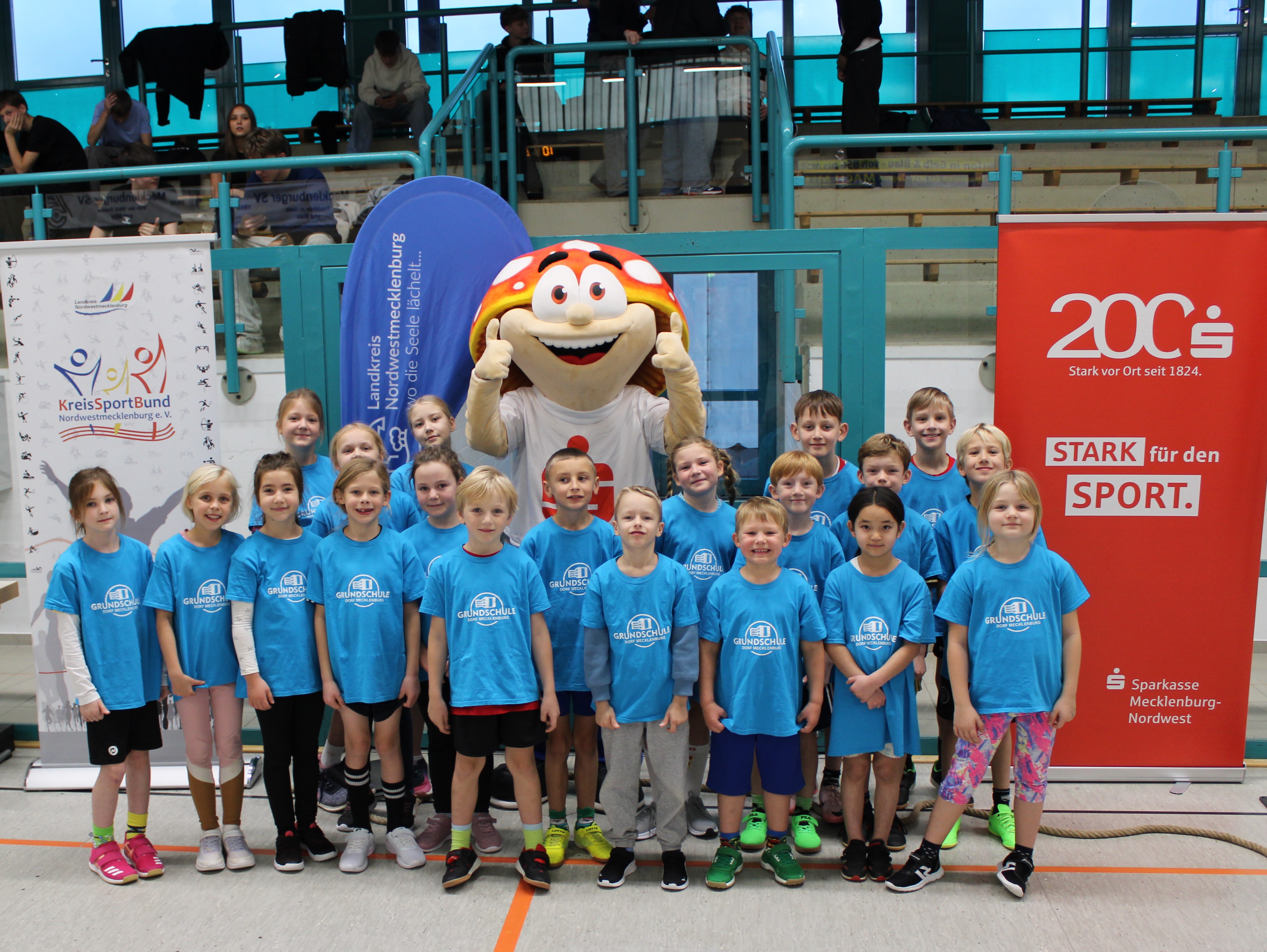 80 Grundschüler aus Dorf Mecklenburg, Schönberg, Proseken und Bobitz waren hochmotiviert. Landrat Tino Schomann ließ es sich trotz vollem Terminkalender nicht nehmen, den kleinen Aktiven viel Erfolg und faire Wettkämpfe zu wünschen. Stefan Possehl, Vorstandsmitglied der Sparkasse MNW und des KreisSportBundes, zeigte sich begeistert von der Veranstaltung und wünschte den Kindern spannende und faire Wettkämpfe. Den Mädchen und Jungen aus den Klassenstufen 1 bis 4 war die Anspannung anzumerken. „Ich bin ganz schön aufgeregt und werde heute mein Bestes geben“, so die Erstklässlerin Hella Groth von der GS Dorf Mecklenburg mit Sportlehrerin Birte Gröger, die am Ende den 3. Platz belegte. In 11 Staffelwettkämpfen wurden die Sieger gesucht. Kraft, Schnelligkeit, Ausdauer und Geschicklichkeit waren gefragt. Die Stimmung, die von Maskottchen Winni, Glückspilz der Sparkasse Mecklenburg Nordwest verbreitet wurde, war grenzenlos. Am Ende jubelte der Titelverteidiger Schönberg, der sich mit deutlichem Vorsprung (45 Punkte) auch in diesem Jahr an die Spitze sportelte. „Es ist toll, dass wir den Pokal verteidigen konnten“, so die Schülerin Ella aus Schönberg. Ein großer Dank geht an die Klasse 9 des Gymnasiums Dorf Mecklenburg für die professionelle Unterstützung als Kampfrichter an den Wettkampfstationen! „Uns hat es viel Spaß gemacht, die Kleinen zu unterstützen“ so die Gymnasiastin Finja Rohde. Dankeschön an die Gemeindevertretung Dorf Mecklenburg für die kostenfreie Bereitstellung der schönen Mehrzweckhalle. Wir danken dem Landkreis Nordwestmecklenburg und der Sparkasse Mecklenburg Nordwest für die Sportförderung, die solche Veranstaltungen erst möglich macht! Danke Wismar TV für die professionelle Begleitung des Grundschulpokals. Der nächste Grundschulpokal wird am 15. Januar 2026 in Wismar ausgetragen.